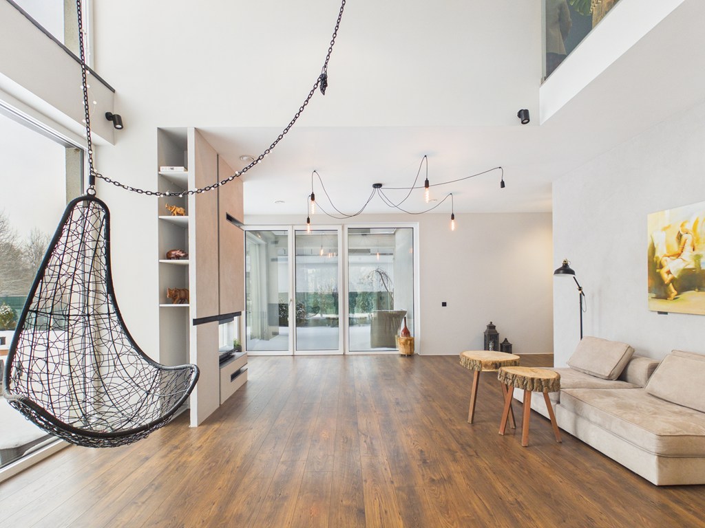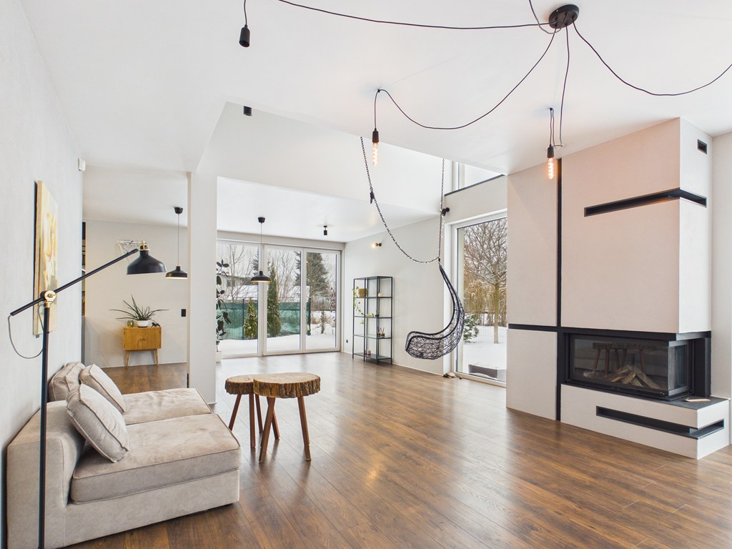 • jasny salon z jadalnią i kominkiem (duże przeszklenia)