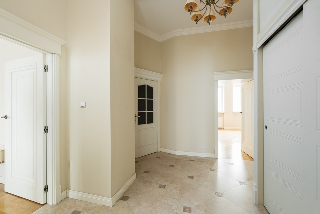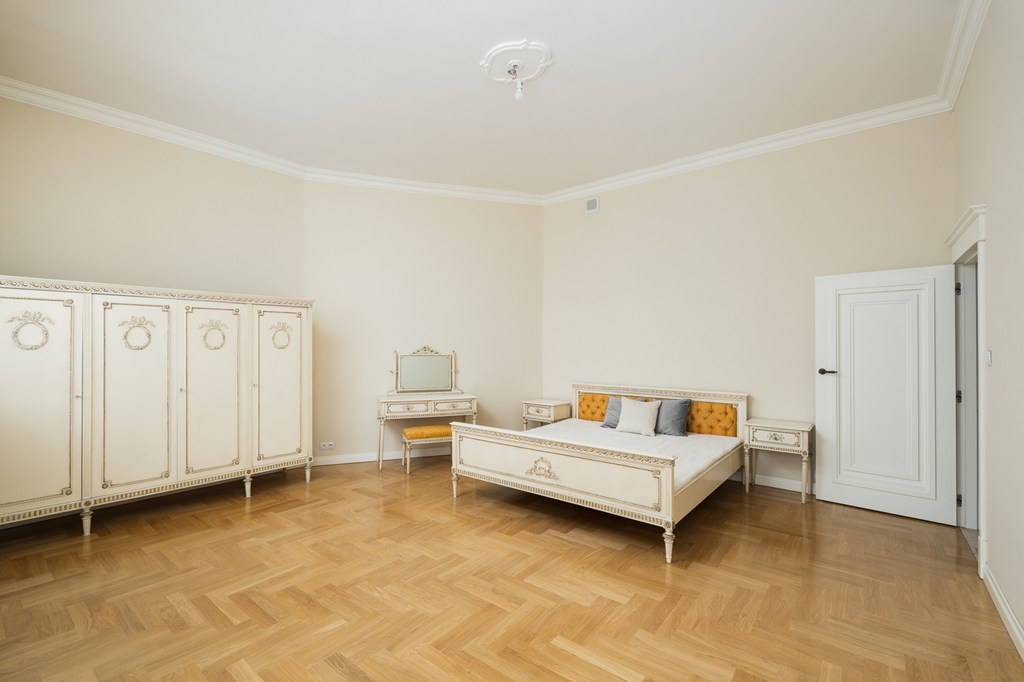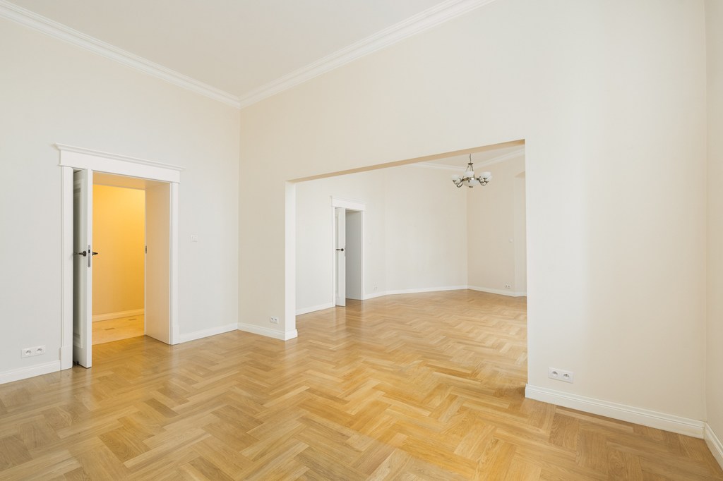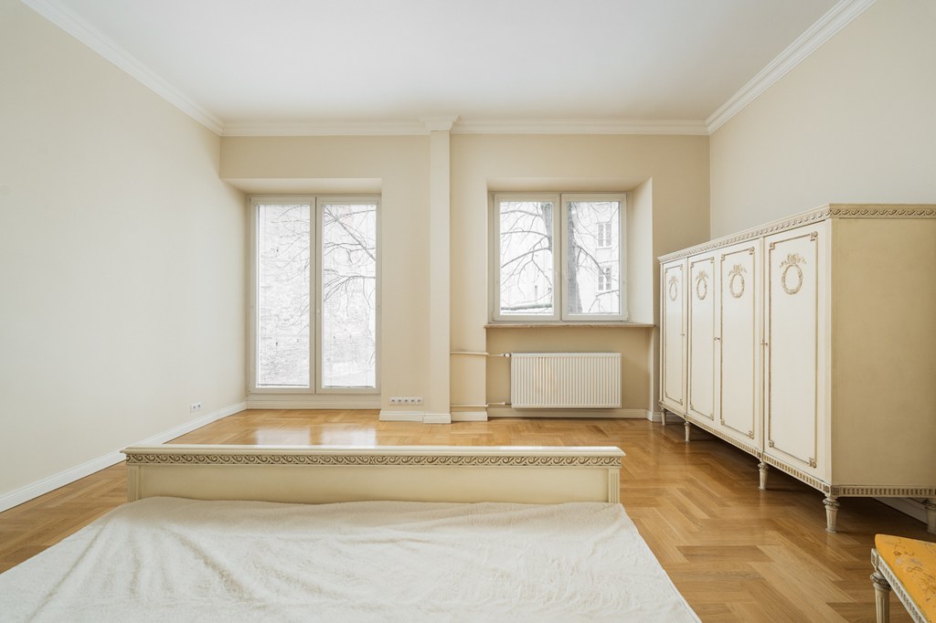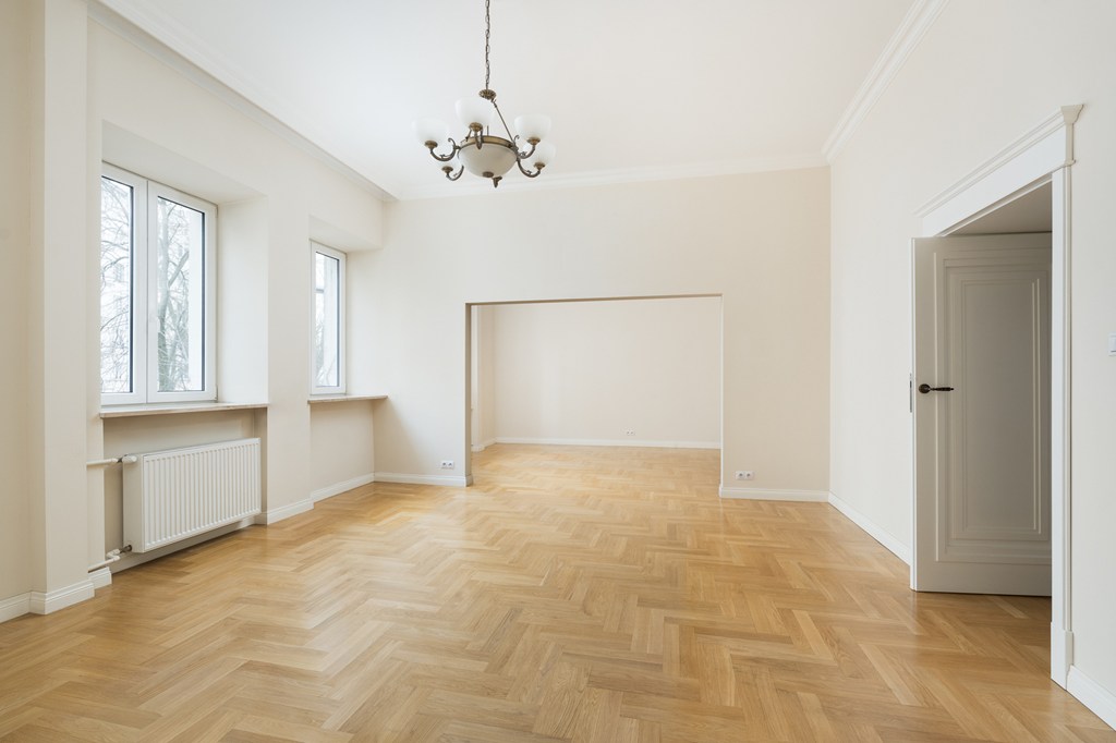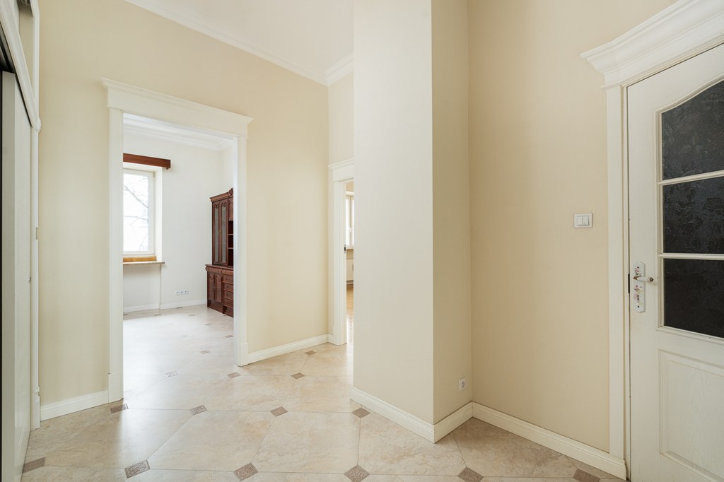 W pozostałej części mieszkania rozciąga się świeżo wycyklinowany, lakierowany parkiet dębowy. Drewniana stolarka drzwiowa nadaje wnętrzu elegancji, przytulności i przestronności. Udogodnieniem jest również wbudowany sejf.
